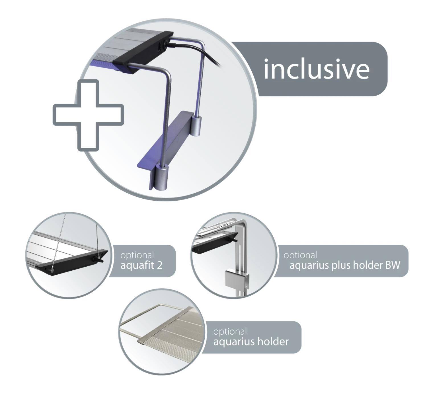 Pour fixer la rampe LEDs, il suffit de monter les supports inclus et de la poser sur les rebords de l’aquarium. Le modèle AQUA MEDIC Aquarius 30 Plus peut s’adapter à un aquarium de 35 à 60 cm de long. Il est possible de suspendre la rampe avec le kit de câble en acier Aquafit 2 (en option) ou fixer sur la vitre arrière avec le kit optionnel Aquarius Plus Holder BW