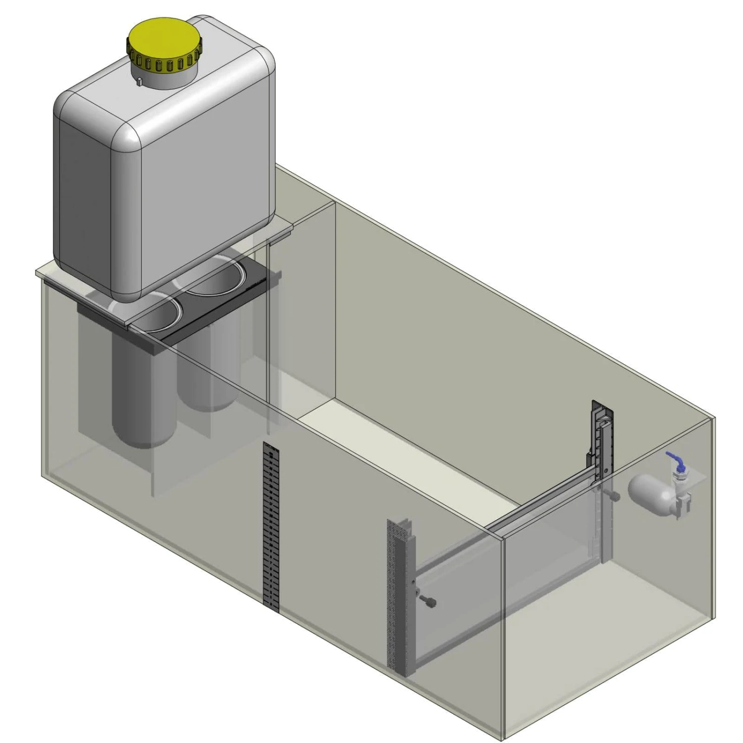 - Dimensions de la cuve de décantation dans le meuble (L x l x H) env. : 90 x 42 x 34 cm