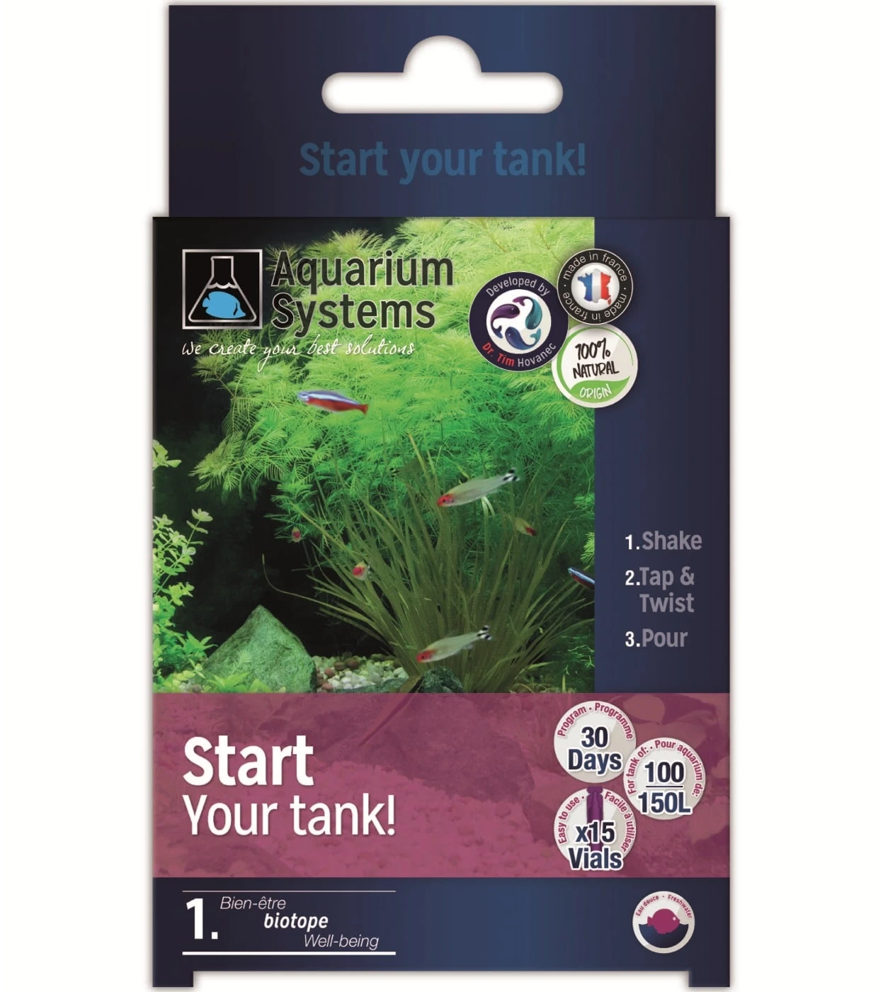 AQUARIUM SYSTEMS Start Eau Douce est un programme contenant 15 Unidoses de produit liquide pour le démarrage en bactéries de votre nouvel aquarium sur 30 jours et pour un volume d’eau de 100 à 150 L environ (aucune crainte de surdosage).