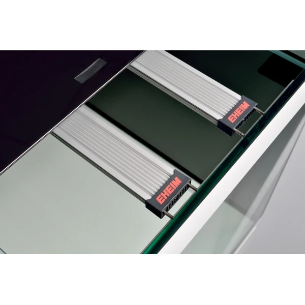 L’aquarium inclus 2 réglettes d’écliarage LEDs : EHEIM powerLED+ daylight (49W) et plants (45W). La puissance lumineuse peut être augmenté en rajoutant d’autres réglettes EHEIM powerLED+. La galerie d’éclairage est composée de plaques coulissantes en verre noir pour un accès très simple à la partie interne de l’aquarium. Ces volets peut être également retirés en toute simplicité.