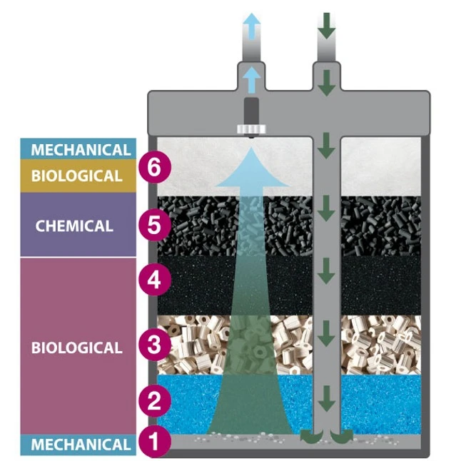 Le filtre extérieur NEWA Kanist 450 a également été optimisé pour assurer une haute efficacité de fonctionnement, avec une grande variété de possibilités qui permettent de garantir un résultat maximum au point de vu filtration mécanique, chimique et biologique. Dès la mise en marche, la pompe puissante commence à pomper l’eau dans le filtre NEWA Kanist 450 pour passer sur 6 stades de filtration. Le volume important des matériaux filtrants traitent tous les contaminants visibles et invisibles.